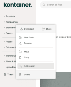 Spacers are a simple but effective way to organize your folder structure in Kontainer DAM. They can help you separate categories, add more breathing room, and make your folders more visually clear.