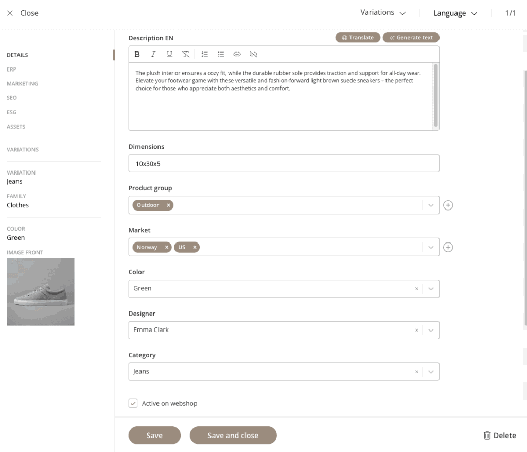 After selecting a family and variation, you’ll be taken to the product edit form. This form will display all the relevant data fields structured according to the hierarchy of the selected product family and variation.