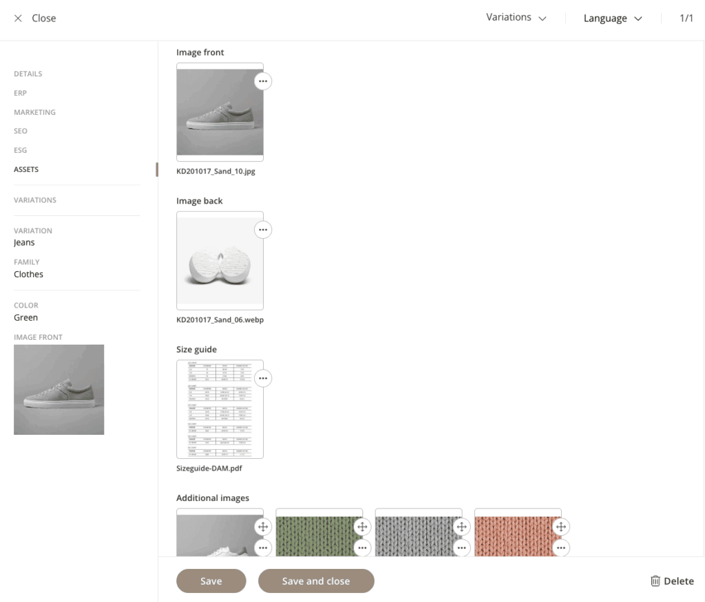 For fields connected to media (like packshots or videos), click the “plus” icon to open the DAM. From there, you can browse using the folder structure or search for the relevant asset—such as a size guide, product image, or video.
