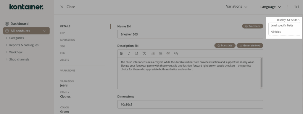 Field Display Modes: You can switch between displaying all fields or level-specific fields—meaning only those fields that apply to the current level of the product hierarchy (parent, variation, or variant).