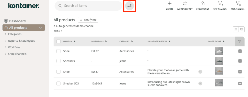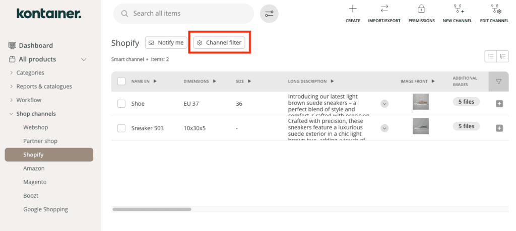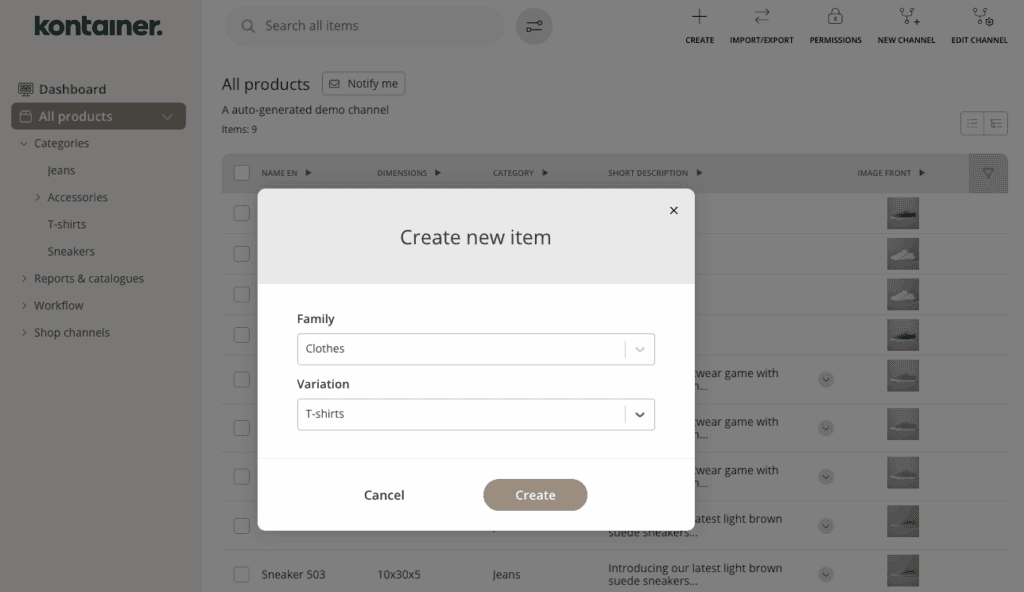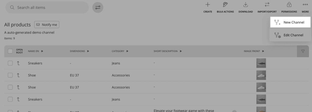 In the main view of Kontainer PIM, go to the upper right corner and click “New channel.”