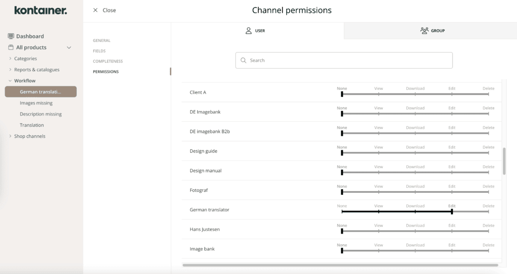 Permissions can be assigned to individual users or user groups and are managed through the following permission levels: