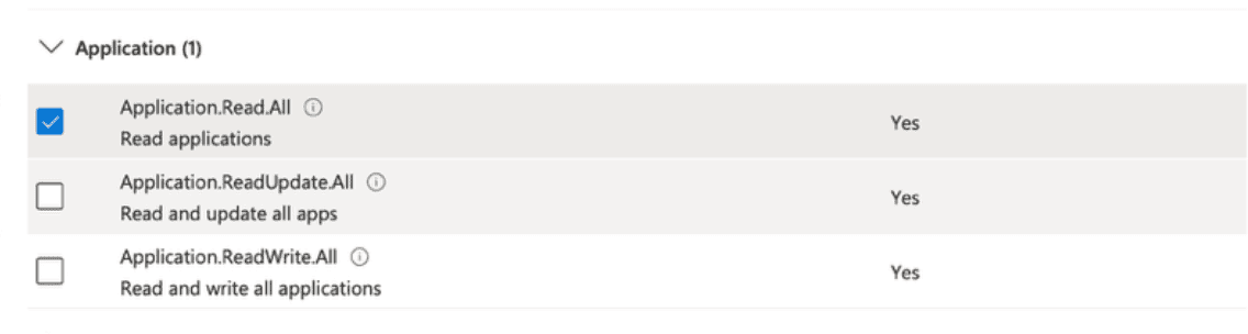 Scrollen Sie zu "Application" und kreuzen Sie “Application.Read.All” an